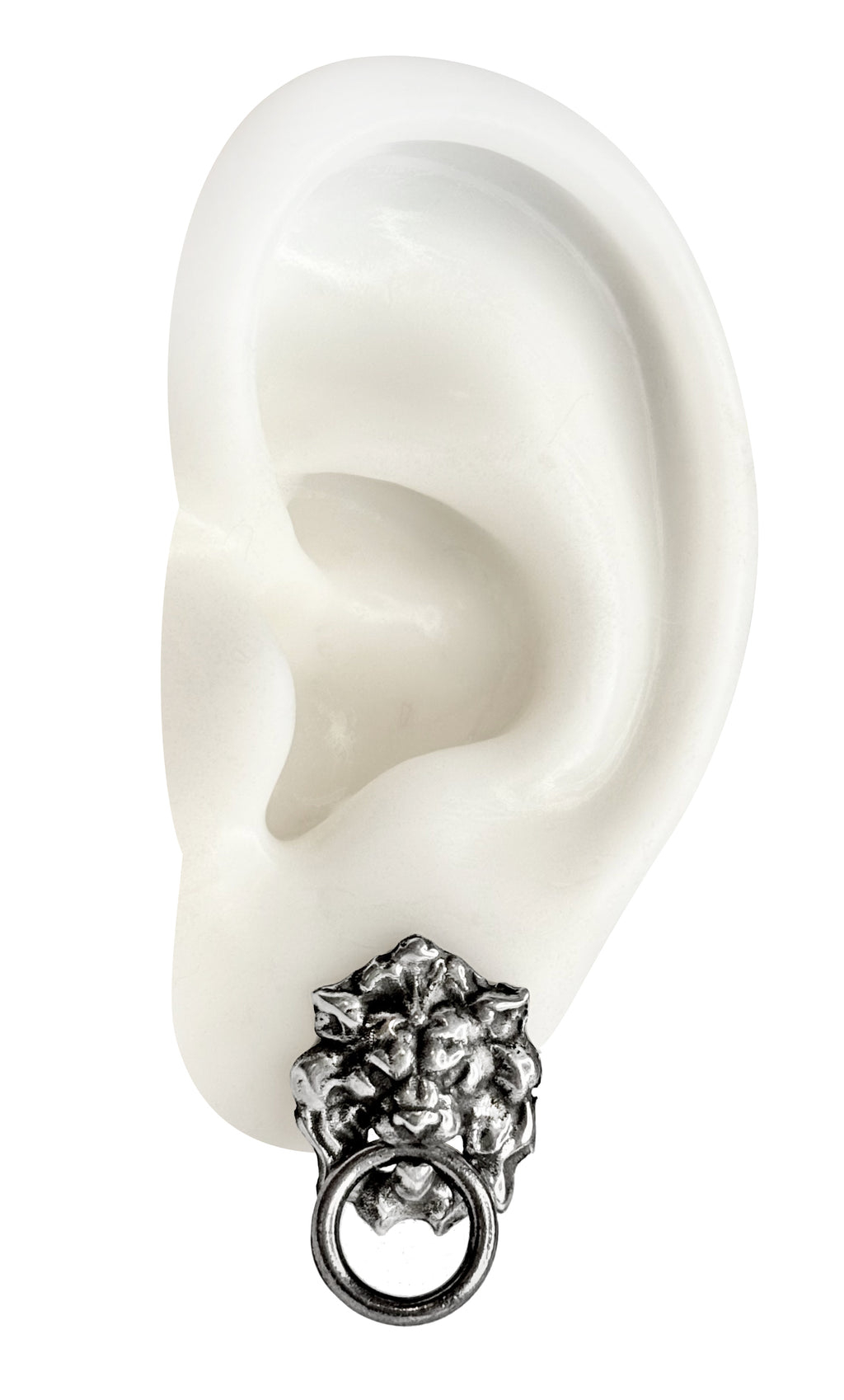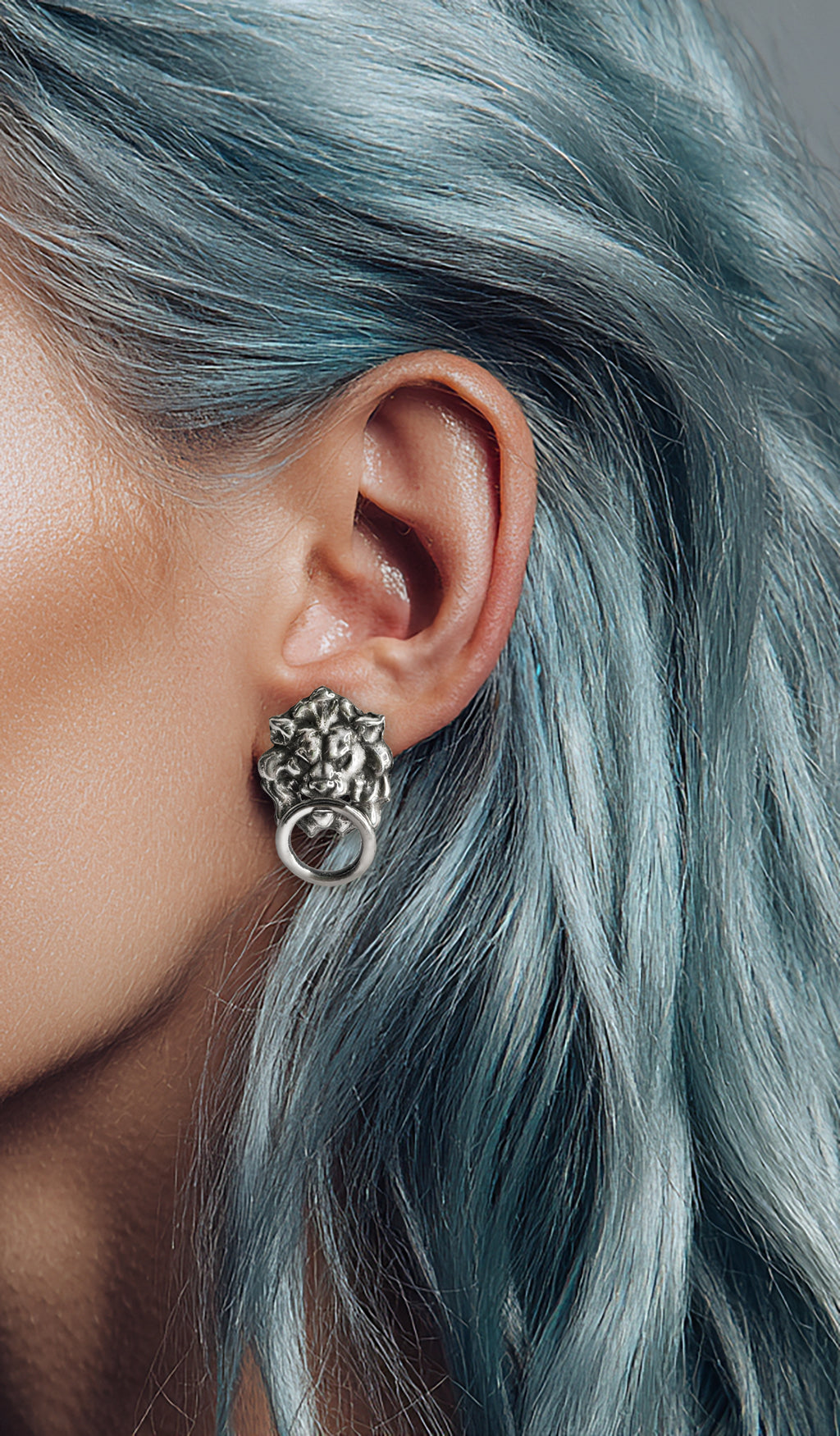 Sculptural lion knocker earrings with detailed ring-in-mouth design. Powerful guardians for everyday wear. Sold as a single or pair.