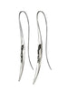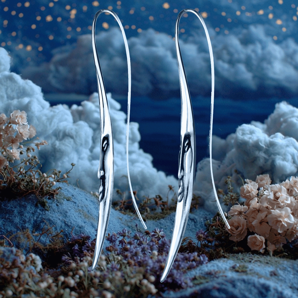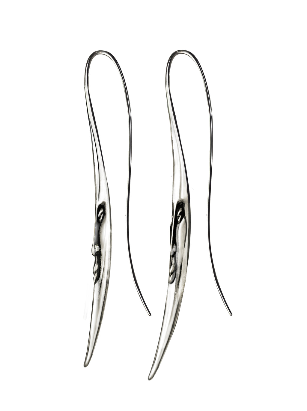 DESCRIPTION & MATERIALSSleek crescent moon earrings with stoic moon face detail. Long whiplike curve extends from the post to complement the neckline.